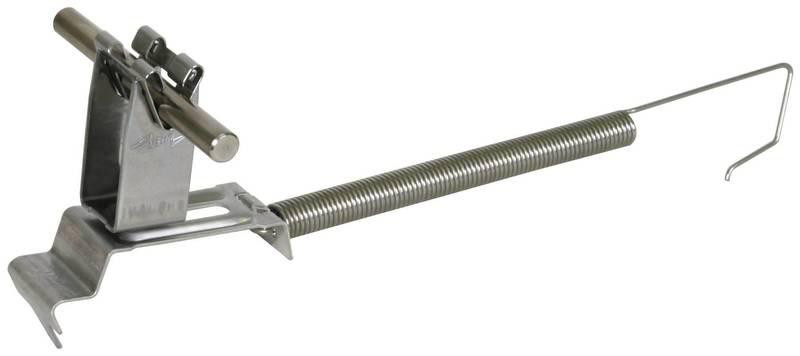 Dachleitungshalter SPANNgrip light zum Befestigen von Fangleitungen auf dem Firstziegel z. B. bei Ziegeldächer. Mit Befestigung durch NIRO-Zugfeder mit Leitungshalter DEHNgrip, lose Leitungsführung, seitlich verstellbar.