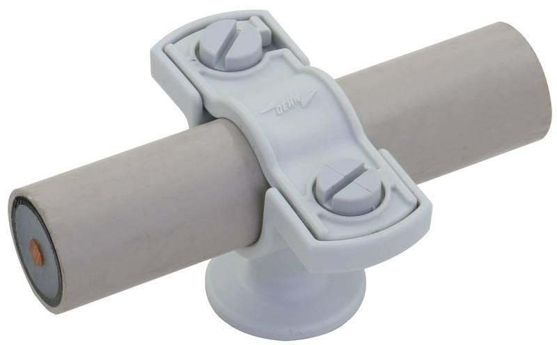 Leitungshalter für HVI Leitung (grau), mit Zweischrauben-Überleger. Ausführung aus Kunststoff, für Wandmontage.