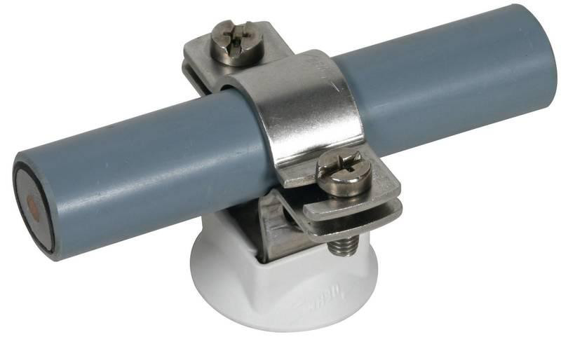 Leitungshalter für HVI Leitung / CUI Leitung, mit Zweischrauben-Überleger, Ausführung NIRO mit Kunststoffsockel, z.B. für Wandmontage.