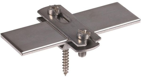 Flachbandhalter mit geschlitztem Überleger (flache Bauform), zum Befestigen von Flachleitern. Ausführung mit Langloch (6,5 x 16 mm) und vormontierter Holzschraube.