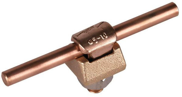 KlemmSchrauben-Verbinder nach DIN EN 62561-1, zum blitzstromtragfähigem Anschluss von Rundleitern z. B. an Flachprofile, Regenrohrschellen oder andere Teile der Blitzschutzanlage. Ausführung einteilig Cu mit Schraube, Federring und Mutter M10.