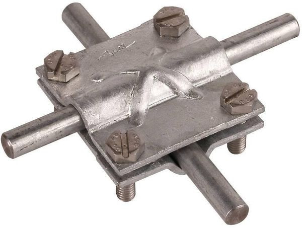 Kreuzstück nach DIN EN 62561-1, für oberirdische Verbindung von Rund- und Flachleitern in Kreuz-, Parallel- und T-Anordnung. Ausführung ohne Zwischenplatte mit Schrauben M6.
