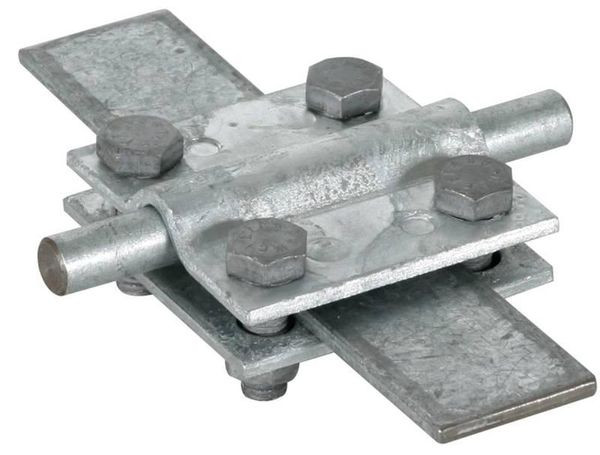 Kreuzstück nach DIN EN 62561-1, für ober- und unterirdische Verbindung von Rund- und Flachleitern. Ausführung ohne Zwischenplatte mit Schrauben M8.