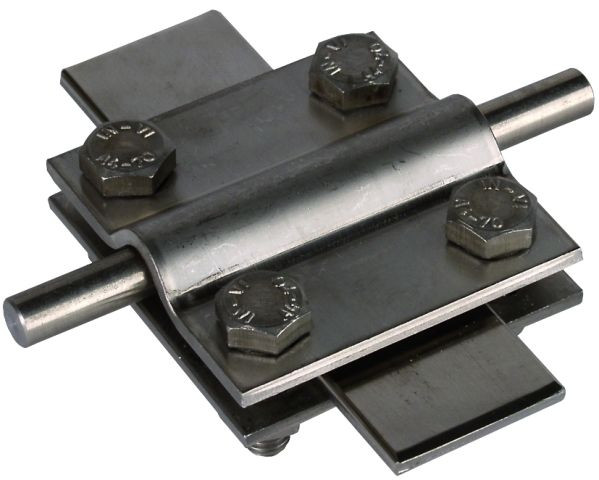 Kreuzstück nach DIN EN 62561-1, für ober- und unterirdische Verbindung von Rund- und Flachleitern. Ausführung ohne Zwischenplatte mit Schrauben M8.