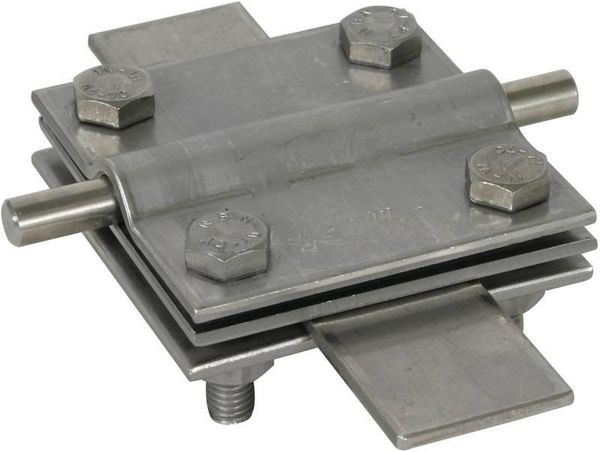 Kreuzstück nach DIN EN 62561-1, für ober- und unterirdische Verbindung von Rund- und Flachleitern (Breite bis 40 mm). Ausführung mit Zwischenplatte und Schrauben M8.