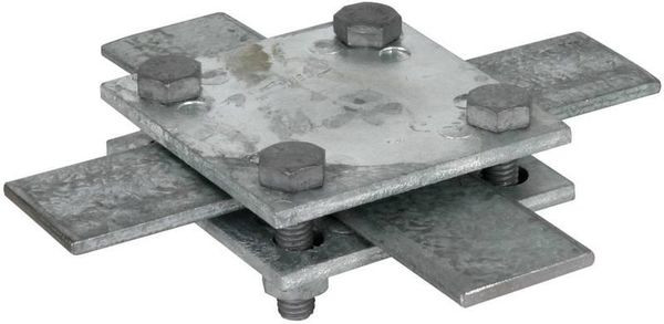Kreuzstück nach DIN EN 62561-1, für ober- und unterirdische Verbindung von zwei Flachleitern (Breite bis 40 mm). Ausführung ohne Zwischenplatte mit Schrauben M8.