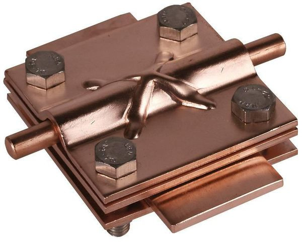 Kreuzstück nach DIN EN 62561-1, für ober- und unterirdische Verbindung von Rund- und Flachleitern (Breite bis 40 mm). Ausführung mit Zwischenplatte und Schrauben M8.