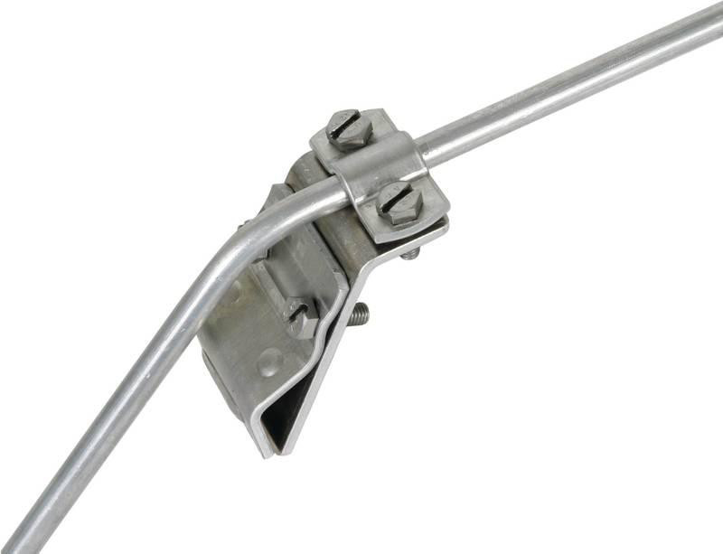 Dachrinnenklemme nach DIN EN 62561-1, zum Verbinden von Rundleitern dem Wulst der Dachrinne. Ausführung mit Zweischrauben-Überleger, Baubreite 40 mm.