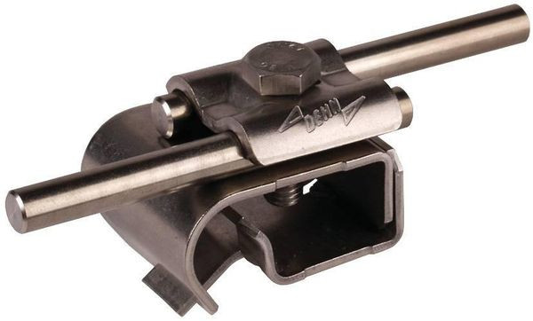 Dachrinnenklemme nach DIN EN 62561-1, zum Verbinden von Rundleitern dem Wulst der Dachrinne. Ausführung mit Doppelüberleger, Leitungsführung längs oder quer.