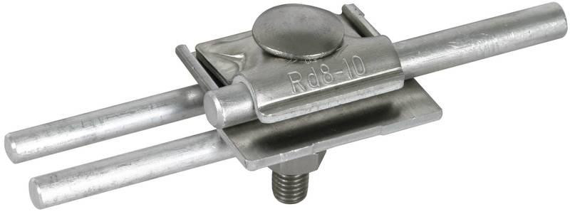FS-Klemme nach DIN EN 62561-1, zum Verbinden von Fangspitzen Rd10mm mit zwei Rundleitern. Ausführung mit Flachrundschraube und Verdrehschutz, für der Anschluss längs oder quer.