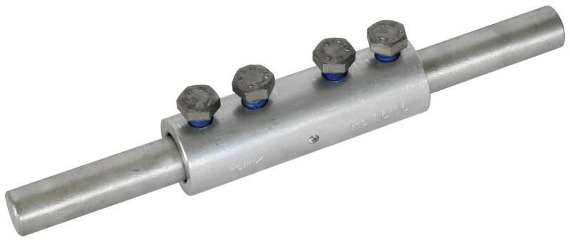 Verbindungsmuffe mit Prägungen (Anschlag) beim Verbinden von Fangstangen (Rd 16 mm) mit größeren Längen (Transportlänge), mit vier Schrauben M8 (gegen selbstlockern gesichert).