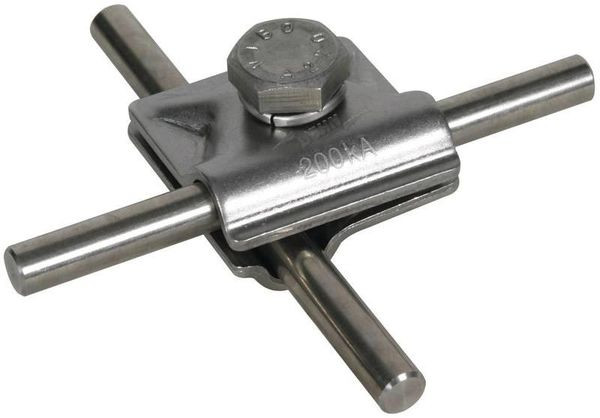 MV-Klemme zur universellen Verwendung als Kreuz-, T- und Parallelklemme. Blitzstromtragfähigkeit geprüft bis 200 kA (10/350 µs) in Anlehnung an DIN EN 62561-1. Ausführung zweiteilig mit Sechskantschraube und Gewinde im Unterteil.