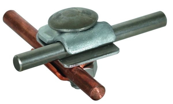 Zweimetall-Mini-MehrzweckVerbindungs-Klemme nach DIN EN 62561-1, zur universellen Verwendung als Kreuz-, T- und Parallelklemme von Rundleitern. Ausführung dreiteilig mit Sechskantschraube und Gewinde im Unterteil.