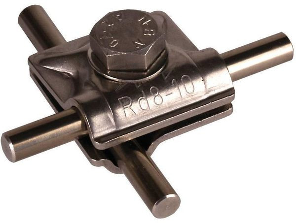 MehrzweckVerbindungs-Klemme nach DIN EN 62561-1, zur universellen Verwendung als Kreuz-, T- und Parallelklemme von Rundleitern. Ausführung zweiteilig mit Sechskantschraube, Federscheibe und Gewinde im Unterteil.