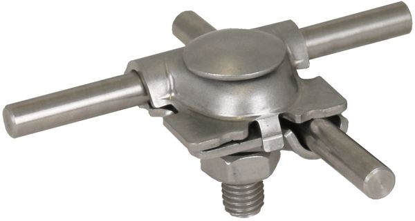 Mehrzweck-Verbindungsklemme mit Verdrehschutz nach DIN EN 62561-1, zur universellen Verwendung als Kreuz-, T- und Parallelklemme von Rundleitern. Ausführung zweiteilig mit Flachrundschraube.