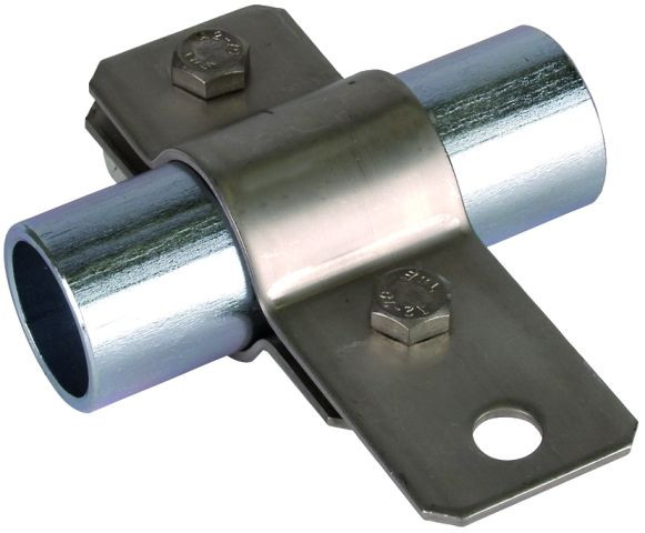 Erdungsrohrschelle Blitzschutz nach DIN EN 62561-1, zum Einbinden von Rohren in den Schutz und Funktionspotentialausgleich nach DIN VDE 0100-410/540 und den Blitzschutz-Potentialausgleich nach DIN EN 62305-3 (VDE 0185-305-3). Ausführung NIRO mit Schrauben M10, Anschluss für Flachleiter mit Schrauben und Muttern M10, für Rundleiter 7-10 mm z. B. KS-Verbinder.