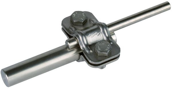 UNI-Trennklemme nach DIN EN 62561-1, zum Verbinden der Ableitung mit der Erdeinführung. Ausführung ohne Zwischenplatte für Erdeinführungsstangen Rd 16 mm.