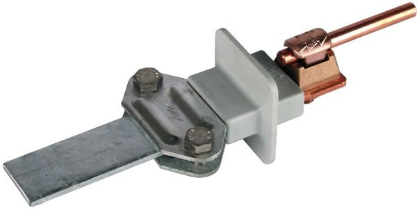 Zweimetall-Trennklemme nach DIN EN 62561-1, mit Schirm für den Zusammenschluss von Leitungen aus unterschiedlichen Werkstoffen. Ausführung für Rundleiter aus Cu und Flachleiter aus St/tZn oder NIRO (V4A).