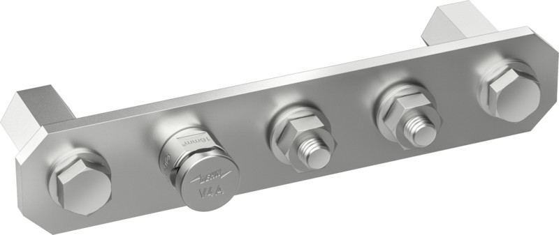 Potentialausgleichsschiene aus NIRO (V4A) für den Schutz und Funktionspotentialausgleich und den Blitzschutzpotentialausgleich. Mit 6-Kant Stützer M10. Ausführung mit 3 Anschlüssen über zwei KS-Verbinder, einem Flachleiteranschluss und zwei Anschlüsse über Schraube und Mutter.