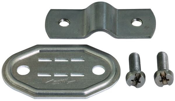 Nummernschild variabel für Rund- / Flachleiter bestehend aus Nummernschild mit Schlitz (Art.-Nr. 490 100), Überleger (Art.-Nr. 480 291) und zweimal Kombischlitzschraube (Art.-Nr. 490 020).