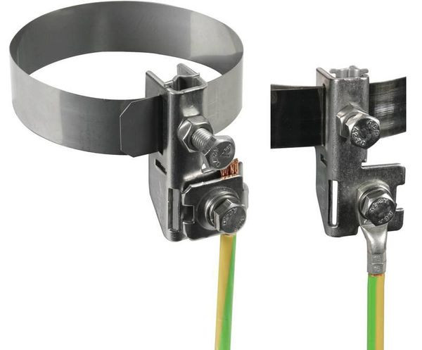 Bandrohrschelle gegen selbstlockern gesischert, nach DIN EN 62561-1, zum Einbinden von Rohren in den Schutz und Funktionspotentialausgleich nach DIN VDE 0100 Teil 410/540 und den Blitzschutz-Potentialausgleich nach DIN EN 62305-3 (VDE 0185-305-3). Ausführung komplett mit stetig verstellbarem Spannband aus NIRO, zum Anschluss von 1 Leiter Rd D10 mm oder 1-2 Leiter Rd D6-8 mm oder 4-50 mm² (ein- / mehrdrähtig).