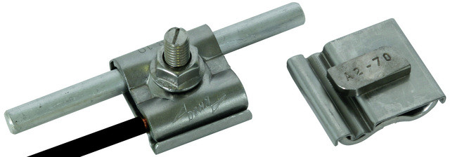 UNI-Erdungsklemme nach DIN EN 62561-1, zum Einbinden der Montagesysteme z. B. von PV-Anlagen in den Funktionspotentialausgleich/Funktionserdung (Leiterfarbe ggf. schwarz) und Blitzschutz-Potentialausgleich nach DIN EN 62305-3 (VDE 0185-305-3). Durch die Kontaktplatte (Zwischenelement) aus NIRO können unterschiedliche Werkstoffe des Leiters (Cu, Al, St/tZn und NIRO) mit den üblichen Montagesystemen z. B. aus Aluminium verbunden werden, ohne dass Kontaktkorrosion entsteht. Ausführung mit Hammerkopfschraube M8x30 mm, Sperrzahnmutter und Doppelüberleger z. B. für die Durchgangsverdrahtung der Profile.