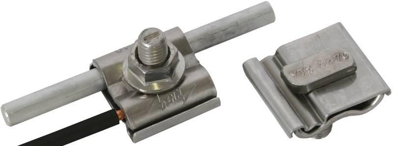 UNI-Erdungsklemme nach DIN EN 62561-1, zum Einbinden der Montagesysteme z. B. von PV-Anlagen in den Funktionspotentialausgleich/Funktionserdung (Leiterfarbe ggf. schwarz) und Blitzschutz-Potentialausgleich nach DIN EN 62305-3 (VDE 0185-305-3). Durch die Kontaktplatte (Zwischenelement) aus NIRO können unterschiedliche Werkstoffe des Leiters (Cu, Al, St/tZn und NIRO) mit den üblichen Montagesystemen z. B. aus Aluminium verbunden werden, ohne dass Kontaktkorrosion entsteht. Ausführung mit Hammerkopfschraube M10, Sperrzahnmutter und Doppelüberleger z. B. für die Durchgangsverdrahtung der Profile.
