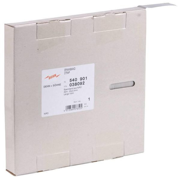 Endlos-Spannband (Länge 100 m), zum Ablängen mit Blechschere. Abmessungen 25 x 0,3 mm aus NIRO, zum Kombinieren mit verschiedenen Spannköpfen z. B. der Erdungs-, Antennen-Bandrohrschelle, Schellenkörper der Ex-Bandrohrschelle.