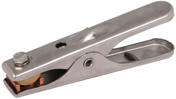 Erdungszange zur kontrollierten Erdung / ableiten statischer Aufladung von Tankwagen, Flugzeugen, Containern und Behältern. Auch für die Anwendung in explosionsgefährdeten Bereichen geeignet. Ausführung klein, Messingbacke mit Stahlspitzen (Werkst.-Nr. 1.4104) und Kontaktbügel aus Kupfer. Anschluss: Flachkopfschraube mit Schlitz oder mit beigefügtem Presskabelschuh 25 mm2 – M6 (Cu/gal Sn).