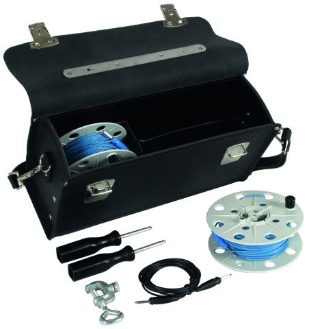 Koffer für die Unterbringung des Durchgangsprüfers und des Messzubehörs. Ausrüstung des Messkoffers: 2 Drahthaspeln mit Abspulgriff und 50 m Messleitung blau, 1 Messleitung 0,75 mm2, 3 m lang (schwarz, beidseitig mit Bananenstecker) und 1 Prüfklemme (Klemmbereich 2-21 mm).
