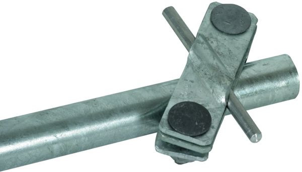 Anschlussschelle nach DIN EN 62561-1, zum Anschluss von Rundleitern, Seilen und Flachbändern an Tiefenerdern. Ausführung schräg mit Flachrundschraube, speziell für Rohrerder Stahl, auch für ungeschnittene Erdleitungen.