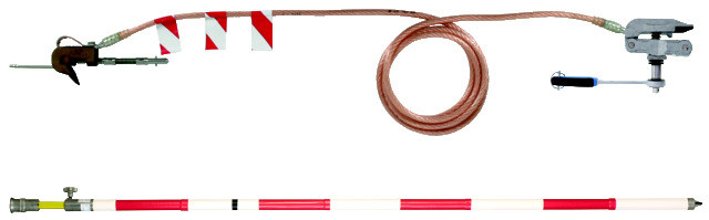 Erdungs- und Kurzschließvorrichtungsset (nicht profilfrei) nach DIN VDE 0683-100 (EN/IEC 61230) zum Erden und Kurzschließen elektrischer Oberleitungen an der Arbeitsstelle nach DIN VDE 0105-100 (EN 50110). Inklusive Teleskop-Erdungsstange und einpolige Erdungs- und Kurzschließvorrichtung, 8,5 m lang, Ausführung Ratsche.