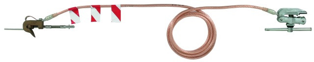 Einpolige Erdungs- und Kurzschließvorrichtung nach DIN VDE 0683-100 (EN/IEC 61230) für Oberleitungen elektrischer Bahnen,; 8,5 m lang, mit Fahrdraht-Erdungsklemme und Schienenanschlussklemme (Knebel) bestückt.