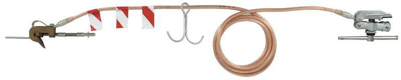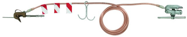 Einpolige Erdungs- und Kurzschließvorrichtung nach DIN VDE 0683-100 (EN/IEC 61230) für Oberleitungen elektrischer Bahnen,; 12 m lang mit Einhängehaken, mit Fahrdraht-Erdungsklemme und Schienenanschlussklemme (Knebel) bestückt.