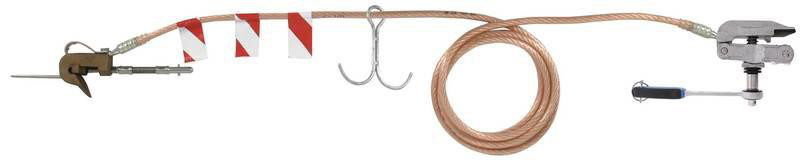 Einpolige Erdungs- und Kurzschließvorrichtung nach DIN VDE 0683-100 (EN/IEC 61230) für Oberleitungen elektrischer Bahnen,; 12 m lang, mit Fahrdraht-Erdungsklemme und Schienenanschlussklemme (Ratsche) bestückt.