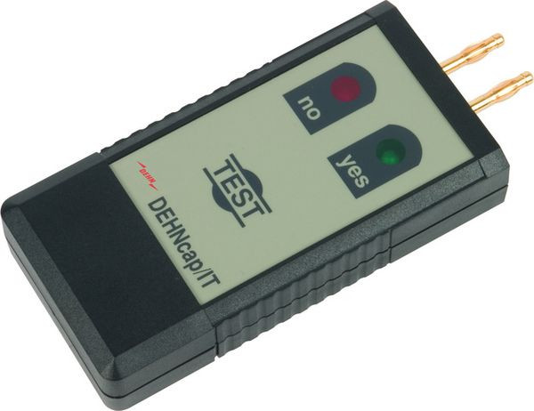 Elektronisches, aktives Schnittstellenprüfgerät DEHNcap/IT-LRM mit zwei getrennten LED-Anzeigen nach DIN VDE 0682-415 (EN/IEC 61243-5) zur Wiederholungsprüfung von Koppelteilen an Schaltanlagen mit HR-Messbuchsen. Nennspannungen bis 45 kV / 50 Hz (Drehstromsystem). Mit integrierter Eigenprüfvorrichtung und Batterieüberwachung.