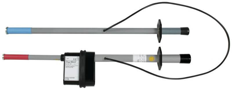 Resistiver, zweischenkeliger Gleichspannungsprüfer PHE/G für Schaltanlagen, Ausführung Pluspol auf Prüfkopf, als zusammengehörige Bauart in Anlehnung an DIN VDE 0682-411 (EN/IEC 61243-1) zum Feststellen der Spannungsfreiheit durch Antasten an der Arbeitsstelle nach DIN VDE 0105-100 (EN 50110-1) in elektrischen Anlagen bis 4,2 kV DC. Auch bei Niederschlägen verwendbar.