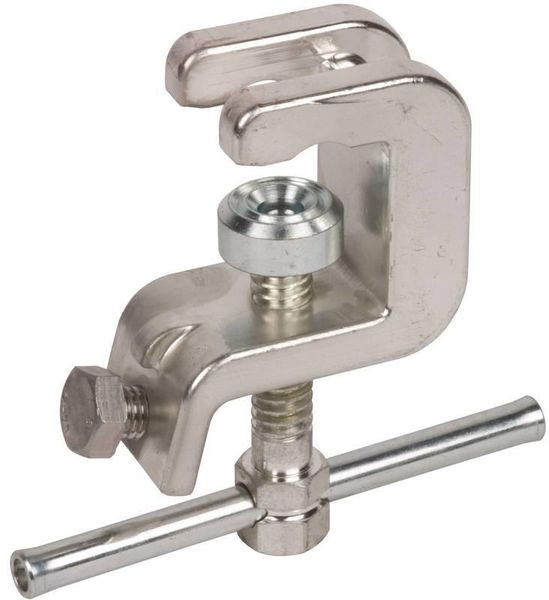 Universalerdungsklemme mit Schraubknebel als erdseitiges Anschlusselement nach DIN VDE 0683-100 (EN/IEC 61230) für Kugelfestpunkte, T-Festpunkte, Flach- und Rundleiter zur erdseitigen Bestückung von Erdungs- und Kurzschließseilen. Mit Verdrehungsschutz Ausführung PK 1.