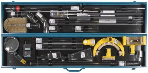 Trockenreinigungsset TRS MS nach DIN VDE 0682-621 zum Reinigen durch Absaugen unter Spannung bis 36kV / 15 ... 60 Hz von Transformatoren und Schaltanlagen in Innenraum- und Freiluftanlagen, komplett im passenden Transportbehälter. Speziell angepasste Arbeitsköpfe zur Intensivreinigung. Steckkupplungssystem zum schnellen Umrüsten der Arbeitsköpfe. Saugluftregulierung im Handhabebereich. Transparente Saugrohre für mehr Sicherheit.