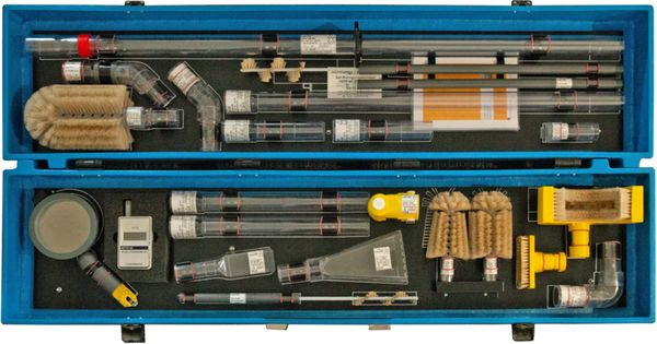 Trockenreinigungsset TRS MS V1 nach DIN VDE 0682-621 zum Reinigen durch Absaugen unter Spannung bis 36kV / 15 ... 60 Hz von Transformatoren und Schaltanlagen in Innenraum- und Freiluftanlagen, komplett im passenden Transportbehälter. Speziell angepasste Arbeitsköpfe zur Intensivreinigung. Steckkupplungssystem zum schnellen Umrüsten der Arbeitsköpfe. Saugluftregulierung im Handhabebereich. Transparente Saugrohre für mehr Sicherheit.