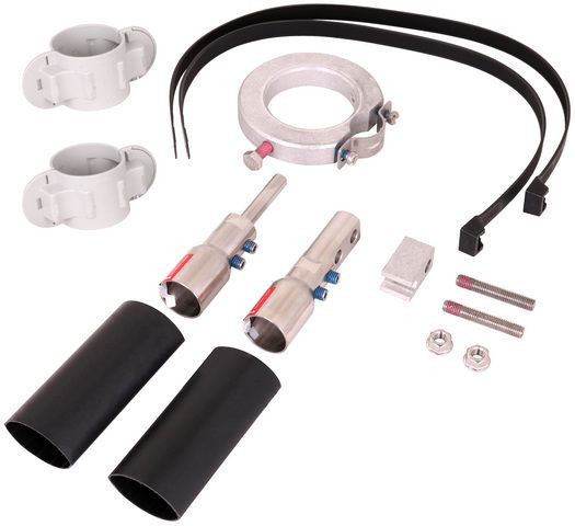 Anschlussset für HVI power Leitung zur Verlegung an HVI power Stützrohren GFK / Al bestehnd aus Anschlusselemente, Gewindestifte, Anschlussteil, Schrumpfschlauch, Kabelbinder und Befestigungsring mit einem geschlitzen Leitungshalter (Ø27 mm).