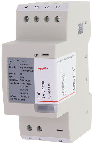 Überwachungsgerät für temporäre Überspannungen zum Anschluss an eine externe Überstromschutzeinrichtung. Für Anlagen wo bereits der Schutz vor transienten Überspannungen durch andere Maßnahmen gewährleistet ist. Erfüllt die Forderungen aus der IEC 63052 Kat. 4.1.3 ". Einstellbares Ausgangsschaltsignal von 12 – 230 V.