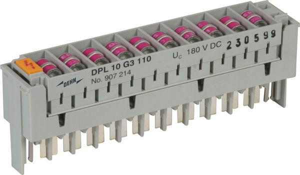 Steckmagazin für 10 DA mit dreipoligen Gasentladungsableitern für nahezu alle Anwendungen. Die Gasentladungsableiter können bei Bedarf einzeln getauscht werden.