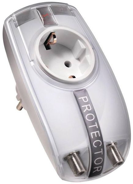kombinierter Überspannungsschutz für Energie- und Antennenseite eines Fernseh-, Rundfunk- oder Videogeräts, mit optischer Betriebs- und Defektenanzeige