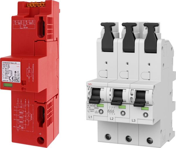 Set aus Kombi-Ableiter Typ 1 + Typ 2 + Typ 3 nach EN 61643-11 für TT- und TN-S-Systeme (3+1-Schaltung) und selektivem Haupt-Leitungsschutzschalter DSHU. Nachträgliche Integration eines einpoligen B6 Leitungsschutzschalters möglich zur Realisierung einer Spannungsversorgung des intelligenten Messystems. Zwei Buchsen für die 230 V Spannungsversorgung (N und L) jeweils für RfZ / APZ gem. VDE-AR-N 4100 sind im Gerät integriert; zum Einsatz auf dem 40 mm Sammelschienensystem im Hauptstromversorgungssystem nach DIN VDE 0100-443 bei Gebäuden ohne äußeres Blitzschutzsystem (auch mit Freileitungseinspeisung); direkte Einspeisung der Außenleiter am selektiven Hauptleitungsschutzschalter, sperr und plombierbar mit einem Bemessungsschaltvermögen von 25 kA nach DIN VDE 0100-537 bzw. DIN EN 60947 nach Charakteristik E.