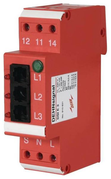 Lichtwellenleiter-Empfangsmodul DEHNsignal E 3 zur selektiven Zustandsanzeige / Sammelstörmeldung von 3 koordinierten Blitzstrom-Ableitern DEHNbloc Maxi S und ggf. DEHNgap Maxi S in 5-Leiter-Systemen mit potentialfreien Wechslerkontakt.