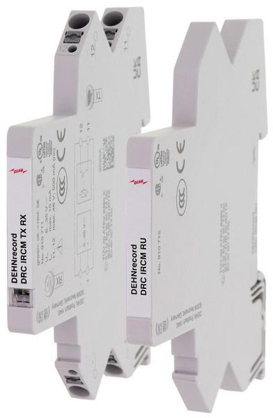 Condition Monitoring Einheit DEHNrecord, Hutschienengeräte-Set mit integriertem optischen Sender/Empfänger sowie optische Umlenkeinheit für die zustandsorientierte Überwachung von Ableitern BLITZDUCTORconnect und DEHNpatch mit LifeCheck. Optische Ableiter-Zustandsmeldung über LED-Sammelanzeige kombiniert mit FM-Signalisierung (Öffnerkontakt).