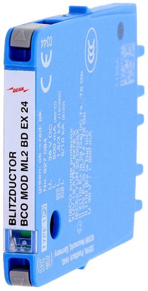 Kombi-Ableiter Schutzmodul in 6 mm Baubreite BLITZDUCTORconnect mit Statusanzeige zum Schutz von 1 Doppelader eigensicherer Messkreise und Bussysteme. Erfüllt Anforderungen nach FISCO. Isolationsfestigkeit 500 V Ader-Erde.