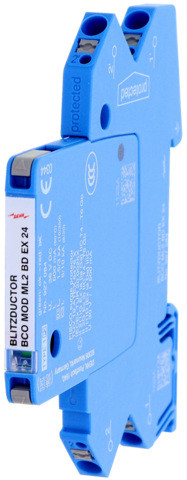 Platzsparender, modularer Überspannungs-Ableiter in 6 mm Baubreite und Push-in Anschlusstechnik mit Statusanzeige zum Schutz von 1 Doppelader eigensicherer Messkreise und Bussysteme. Erfüllt Anforderungen nach FISCO. Isolationsfestigkeit >500 V Ader-Erde. Mit Signaltrennung für Wartungszwecke.