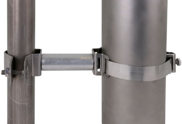 Befestigungsschelle mit Spannband, zum Befestigen der Stützrohre DEHNiso-Combi z. B. am Antennenstandrohr oder anderen Rohren. Ausführung mit Distanzstück Länge 95 mm, um Halterungen von z. B. Antennen auszugleichen..